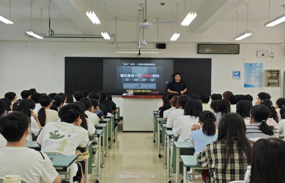 国家金融人才服务中心首席数据官莫坤荣教授则聚焦“乌卡时代(VUCA)的挑战与数字经济的应对之道”。他系统分析了当前国际层面(俄乌战争、国际贸易冲突)与国内层面(通缩风险、消费投资意愿不足)的复杂经济形势,明确指出数字经济已成为应对时代挑战、驱动经济高质量发展的核心引擎。同时,莫教授详细解读了数据要素的战略定位及“数字中国 2522 框架”等国家数字经济发展战略,强调在就业竞争加剧的背景下,掌握数字技能是破解就业压力、抓住时代机遇的关键,呼吁新生主动提升专业能力,以适配行业与时代需求。