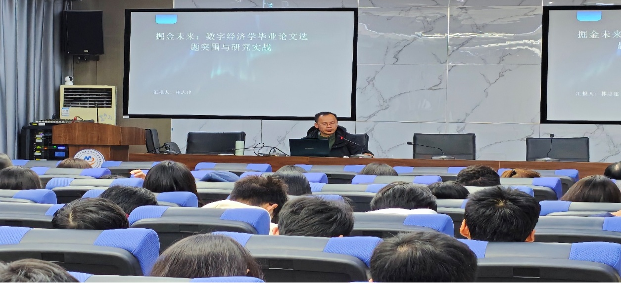 讲座由林志建老师主讲。他从毕业论文的深层价值出发,指出论文不仅是学业任务,更是展现综合能力与专业素养的“学术名片”。林老师强调,数字经济作为数据驱动、贴近现实、创新空间广阔的前沿领域,极具研究价值,是同学们开展高质量论文的理想方向。在“好选题的基石与灵感来源”环节,林老师系统阐述了选题应立足的四大基石:个人兴趣、问题意识、创新可行性及价值意义,并分享了六大灵感渠道,包括经典理论与前沿趋势结合、政策热点与行业动态追踪、课程延伸与深度阅读、数据挖掘技术应用、现实问题观察以及对现有研究的批判反思。他还特别提醒同学们注意避开“题目过大、缺乏新意、技术黑箱”等常见误区。