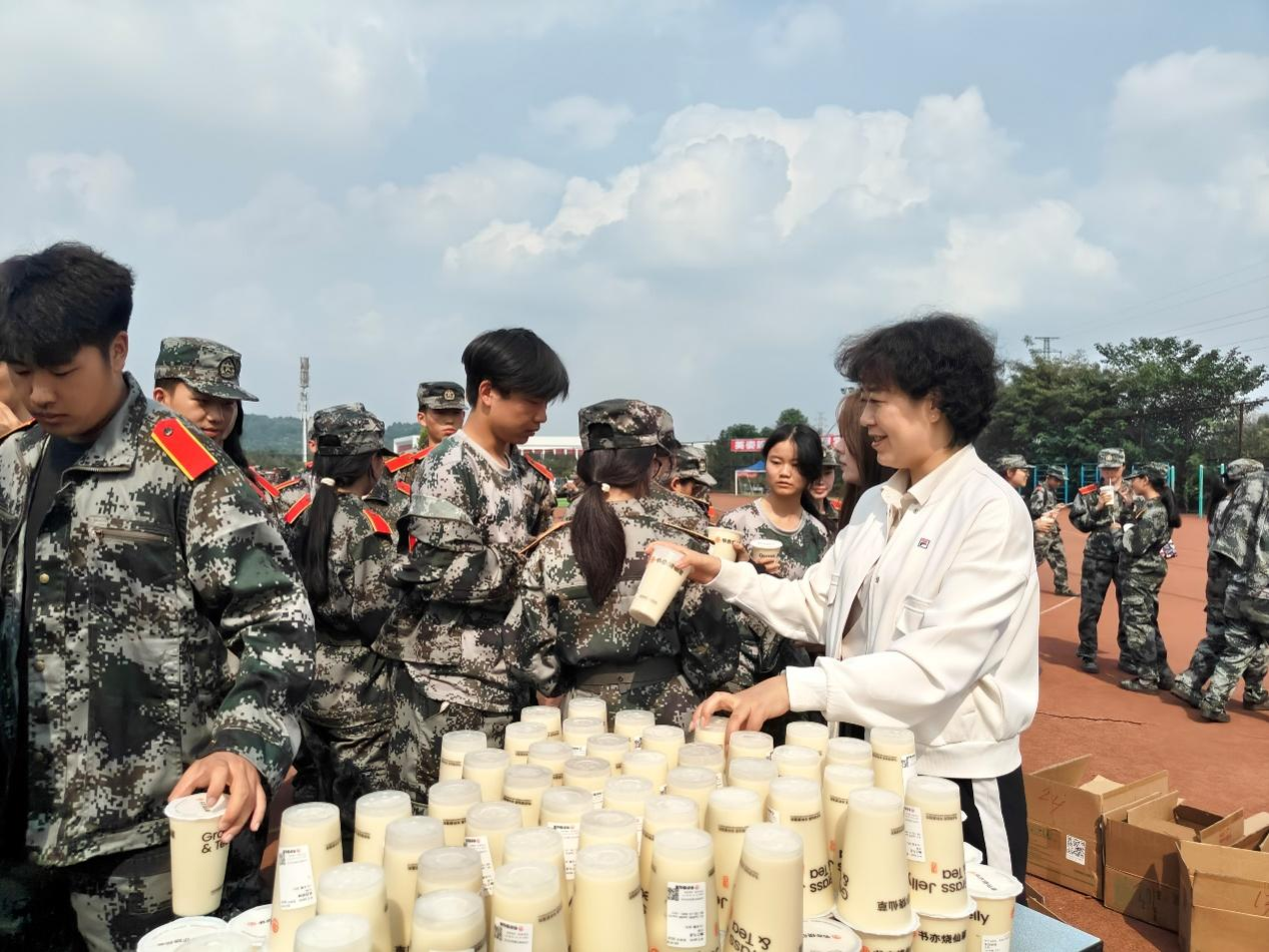 杜宇佳一行与同学们亲切地交谈,询问大家的训练情况、身体状况以及生活需求,并鼓励大家勇敢面对军训中的困难和挑战,不断提升自我,追求卓越。随后,学院将精心准备的奶茶送到每一位军训学生的手中。这份突如其来的惊喜让在场的同学们激动不已,纷纷表示感受到了来自学院的关怀与温暖。